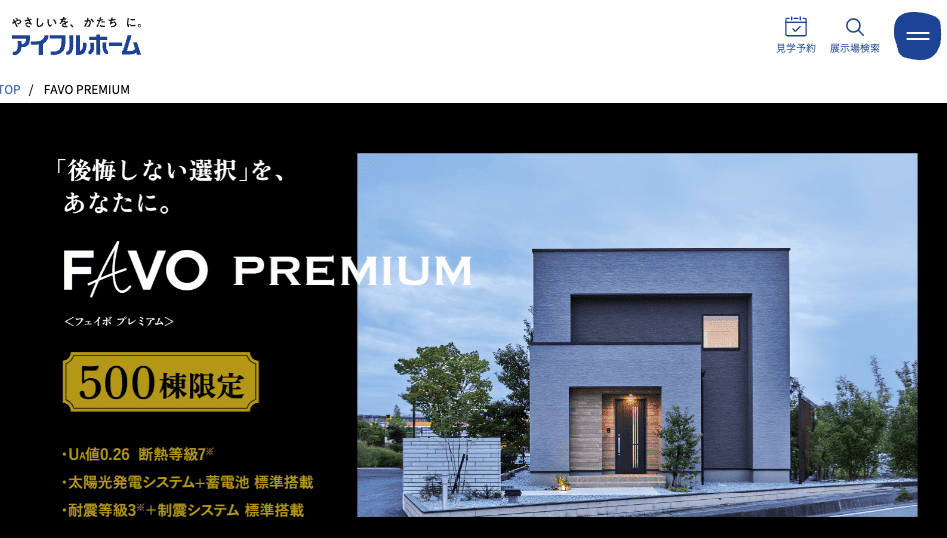 | アイフルホーム | 0.26 | 耐震等級3+制震 | 構造・防水・防蟻20年 | 太陽光+蓄電池標準、超高性能でコスパ◎ |
